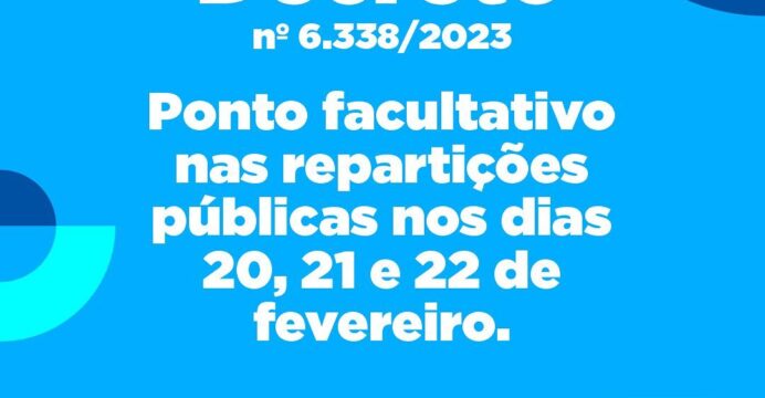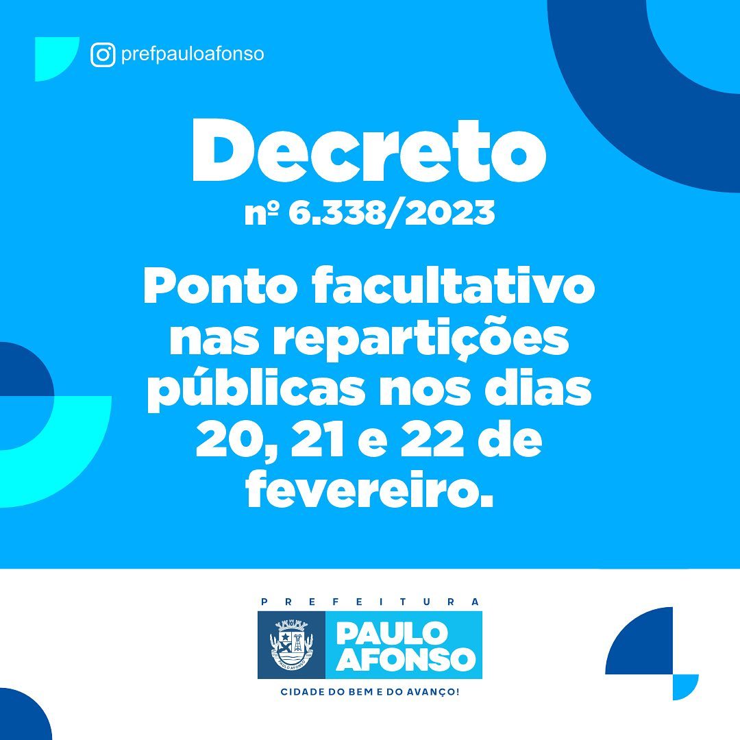 A Prefeitura de Paulo Afonso decreta ponto facultativo nas repartições públicas nos dias 20, 21 e 22 de fevereiro, segunda e terça-feira de carnaval e quarta-feira de cinzas.