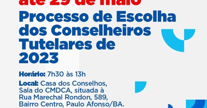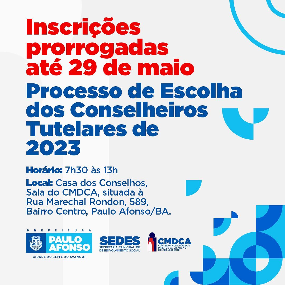As inscrições continuam sendo realizadas das 7h30 às 13h, presencialmente, na Casa dos Conselhos, Sala do CMDCA, situada à Rua Marechal Rondon, 589, Bairro Centro, Paulo Afonso/BA.