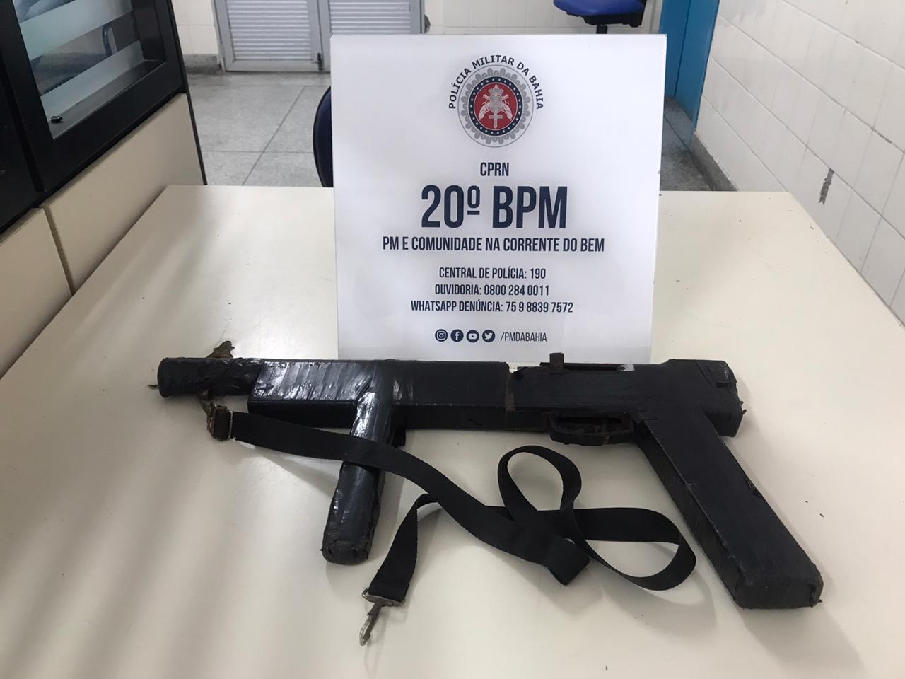Diante das informações, os policiais deslocaram ao local mencionado e adentraram ao matagal, na tentativa de localizar o referido veículo. Após buscas, conseguiram localizar um veículo GM/Corsa Sedan, ano de fabricação 2004, cor bege, e no seu interior foi encontrada uma arma de fabricação caseira, tipo simulacro de fuzil.