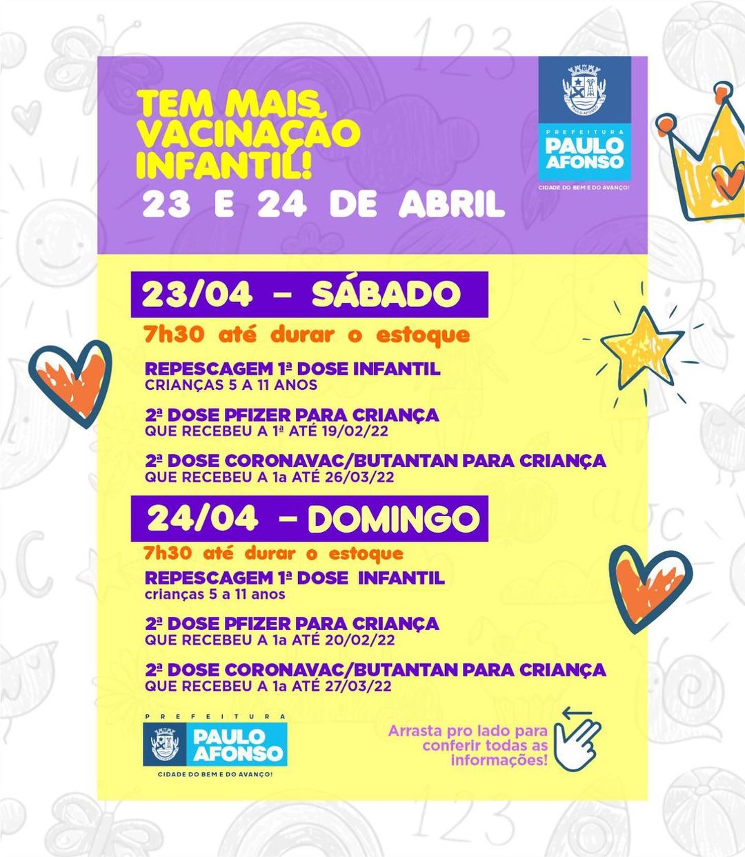 Neste fim de semana tem vacinação infantil em Paulo Afonso Bahia, sábado 23 de abril de 2022 e domingo 24 de abril de 2022! As informações estão nos cards, confira!