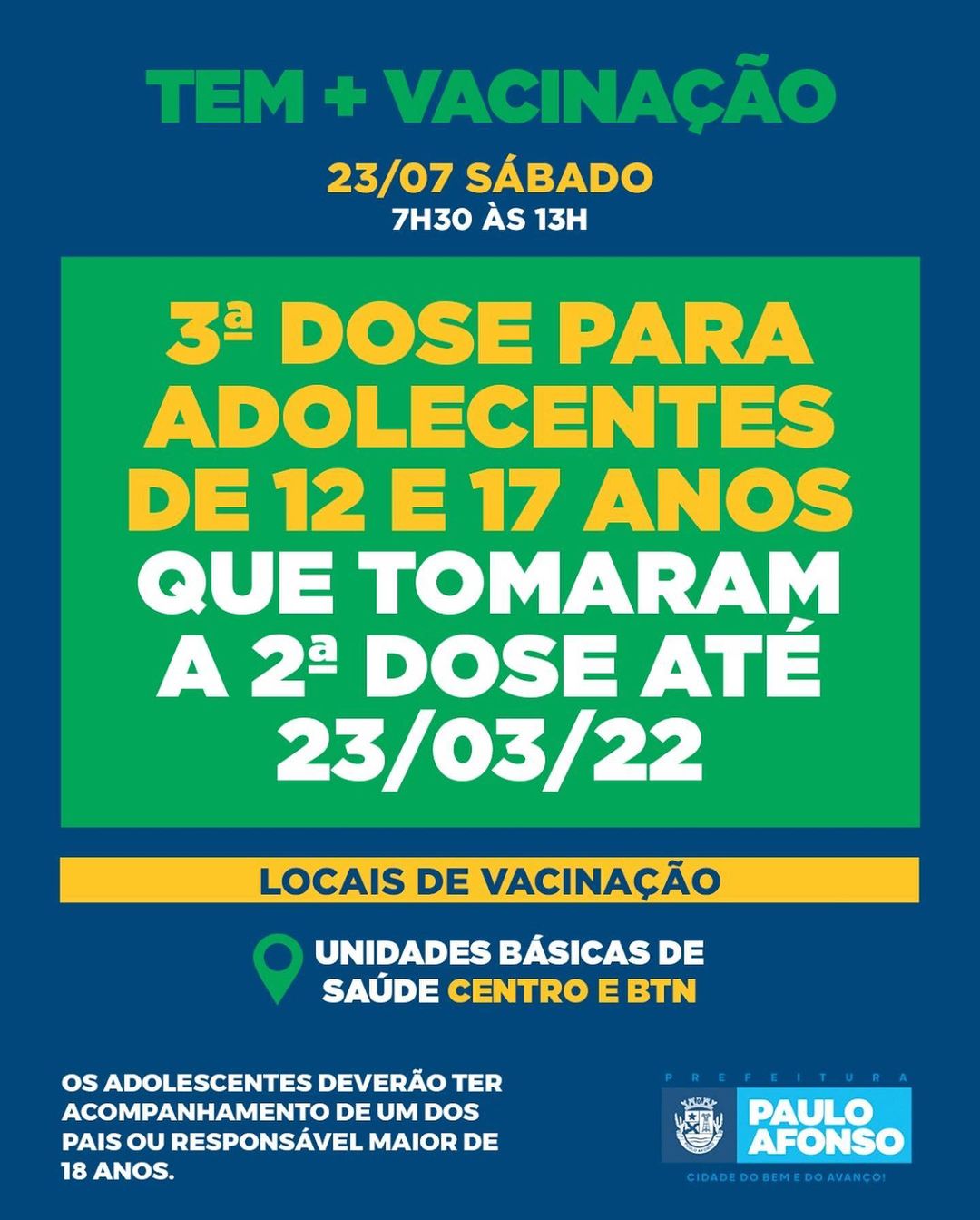 Neste sábado (23), a Secretaria de Saúde realiza mais uma etapa de vacinação contra a Covid-19 com a 3ª dose, que atenderá os adolescentes de 12 a 17 anos, que tomaram a 2ª dose até 23 de março.