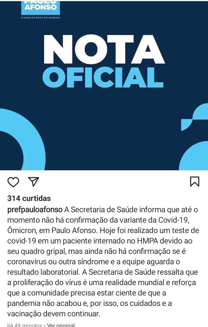 A Prefeitura Municipal através da Secretaria Municipal de Saúde de Paulo Afonso Bahia, emitiu NOTA OFICIAL informando que a informação que circula não procede com os fatos. A Variante Ômicron não foi detectada no município, todos os pacientes suspeitas de Covid-19 estão sendo monitorados pela secretaria.