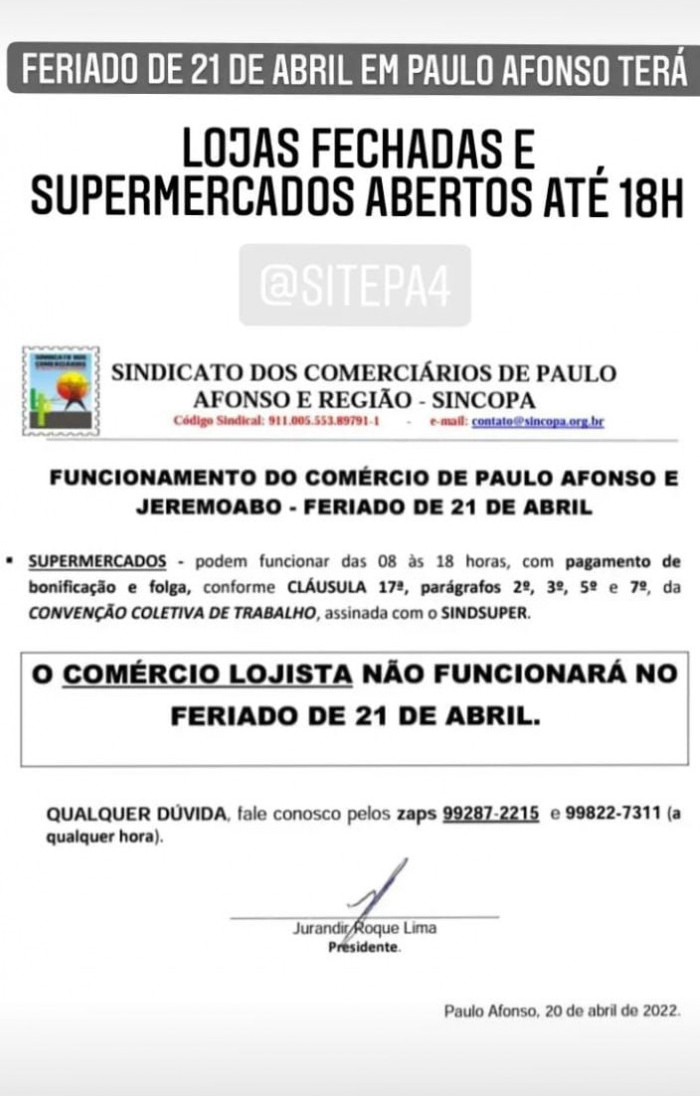 O funcionamento do Comércio e Supermercados de Paulo Afonso e Região no feriado de 21 de abril de 2022 obedecerá a Clausula 17ª, parágrafos 2ª, 3ª, 5ª e 7ª da Convenção Coletiva de Trabalho assinada com o SINDSUPER.