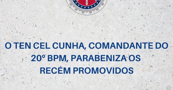 Com base nisto, o Comandante do 20º BPM, Ten Cel PM Cunha, parabeniza a conquista dos valorosos policiais militares por terem conseguido alcançar tão merecida promoção. Que os novos Sub Tenentes continuem sendo orgulho para suas famílias e para a corporação, ao se doar para a sociedade pauloafonsina por meio da nobre missão que é ser policial militar e que continuem sendo exemplo de esforço e perseverança para aqueles que os cercam.