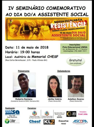 Dois debatedores também farão parte do IV Seminário, são eles: Adailton Soares (Assistente Social) e Járita Valéria (Assistente Social), ambos da cidade de Paulo Afonso-BA. O dia 15 é o dia oficial, no entanto a UNISA fará seu evento comemorativo no dia 11 de maio de 2018. Imperdível!!!!