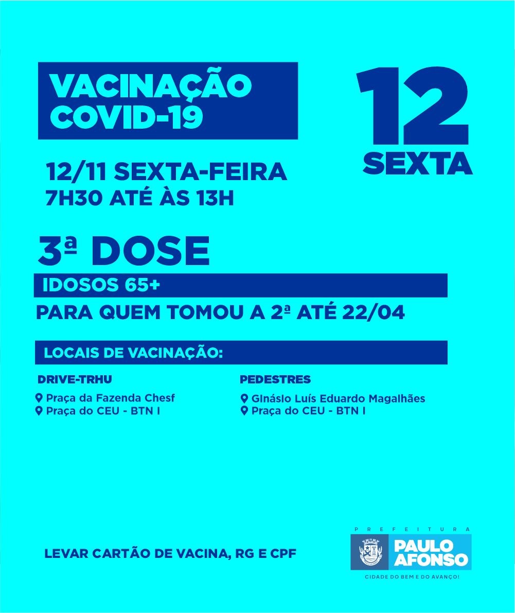 Nesta sexta-feira (12) tem a aplicação da 3ª dose destinada aos idosos acima de 65 anos e trabalhadores de saúde que receberam a 2ª dose até 22 de abril. O horário para as duas categorias acontece de 7h30 às 13h, mas os locais de vacinação são diferentes.
