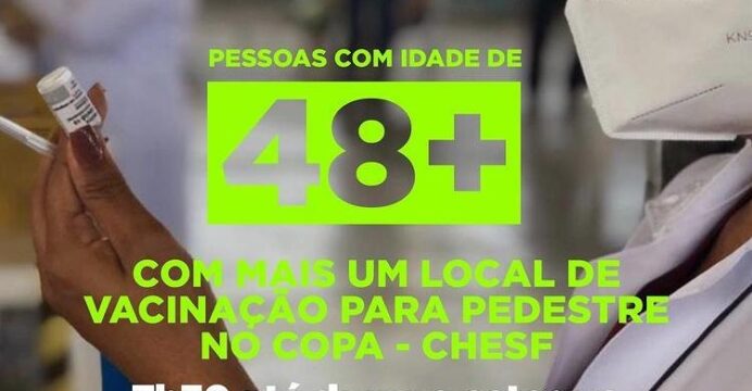 Nesta terça-feira (29) tem 1ª dose para pessoas a partir de 48 anos. Além da redução da faixa etária, a novidade desta etapa é a inclusão do Clube Operário Paulo Afonso (COPA) como mais um ponto para pedestres. A imunização terá início às 7h30 até durar o estoque.