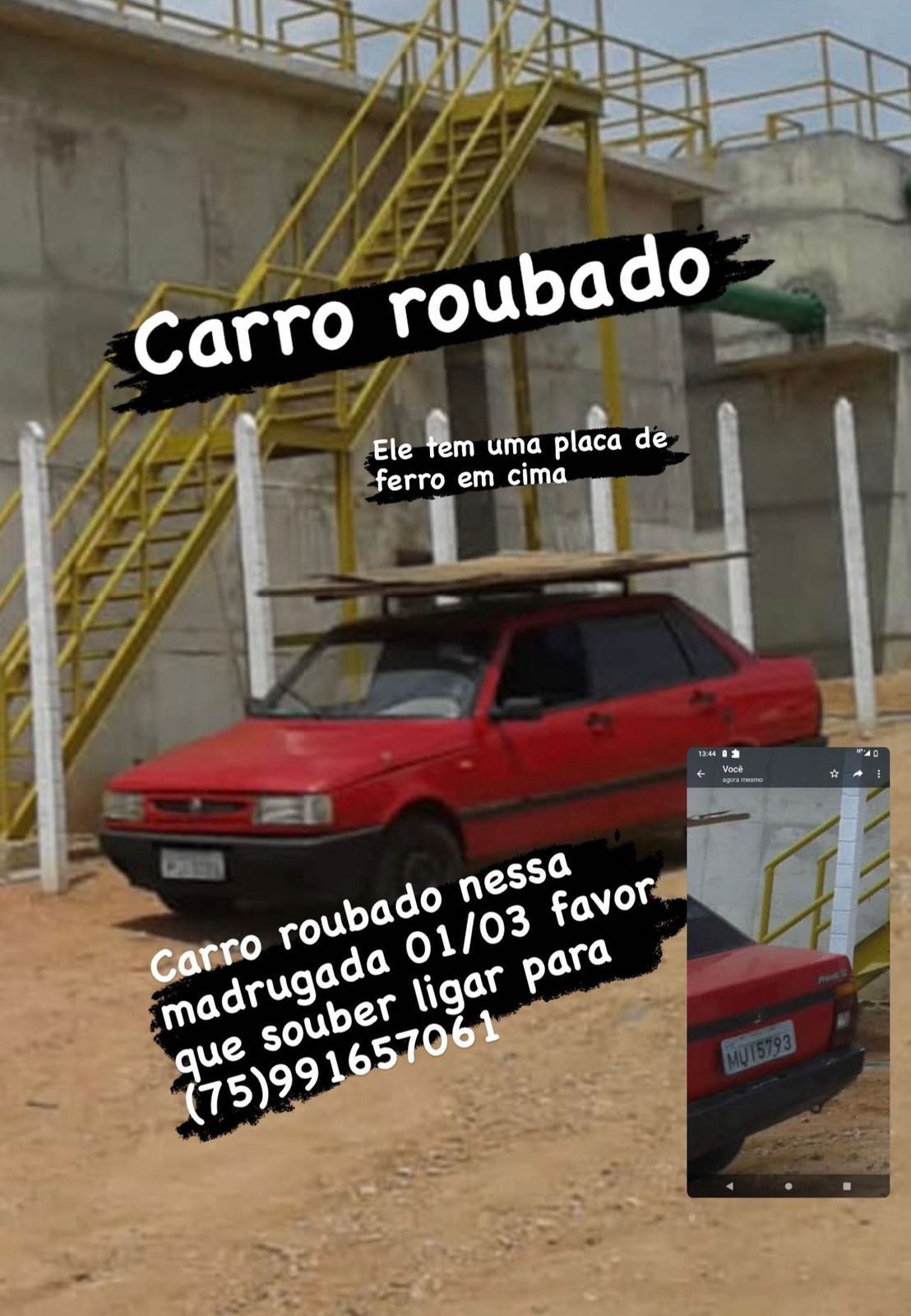 Esse veículo tem uma chapa de ferro fixa em cima para atividades de transportes da Serralharia do Senhor Ernandes. Informações ligue para o número 75-99165-7061. Ou ligar para Polícia Militar no 190.