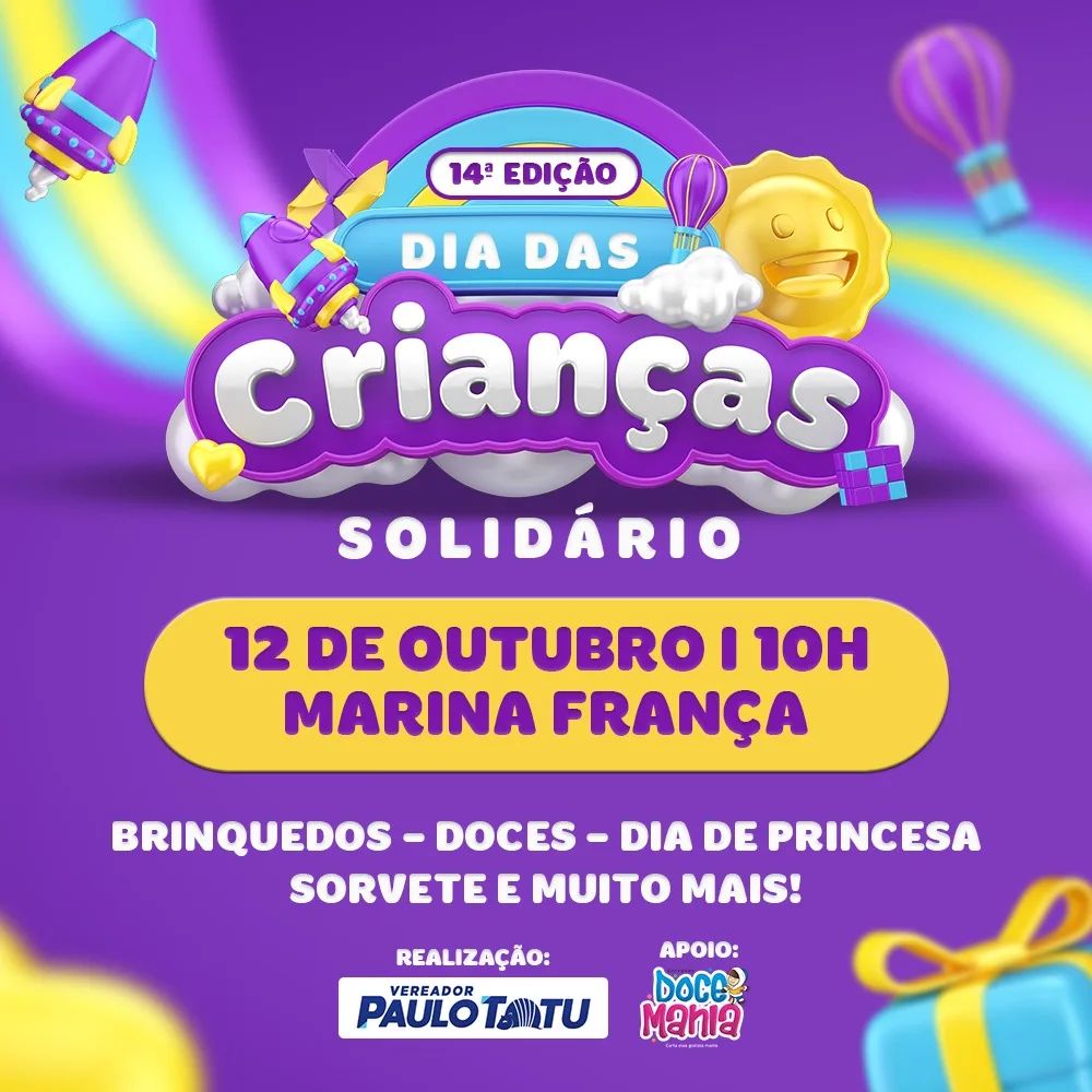 O Gabinete do Vereador Paulo Tatu-Progressistas dando continuaidade a tradicao nesse dia 12 das crianças que se aproxima, vamos estar realizando a 14° edição do Dia das Crianças Solidário do Bairro Marina França.