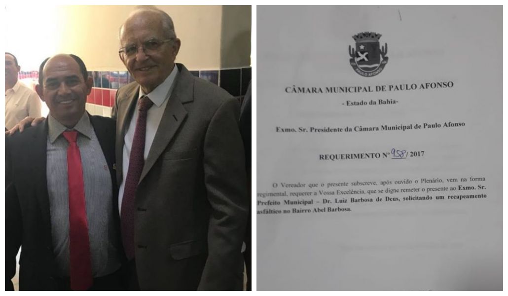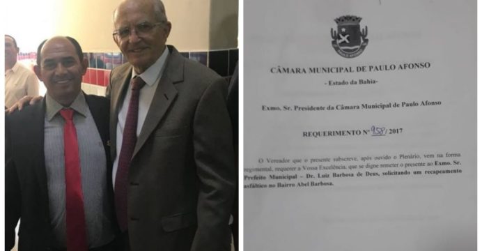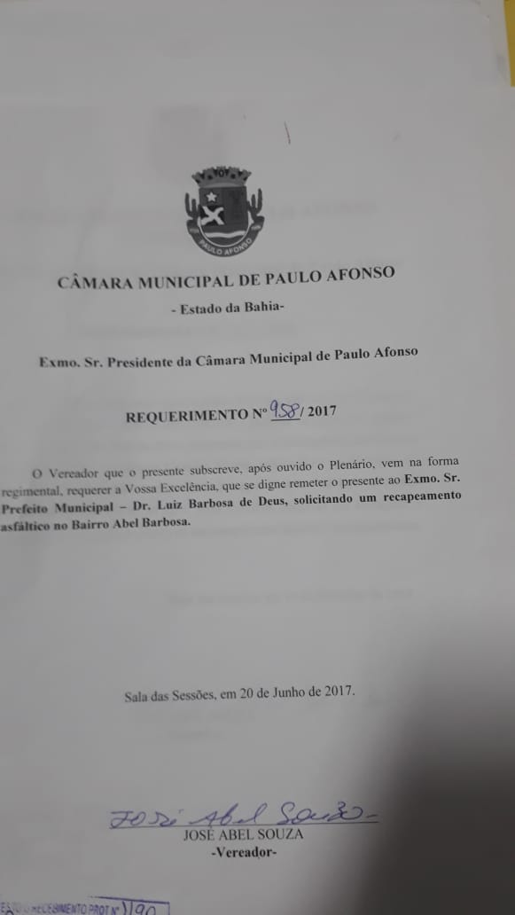 O vereador José Abel Souza “Zé de Abel” (Podemos) teve seu Requerimento 958/17 aprovado por unanimidade dos vereadores da Câmara de Vereadores de Paulo Afonso Bahia. Este requerimento solicita do Prefeito Luiz Barbosa de Deus (PSD), recapeamento asfáltico em todas as ruas do Bairro Abel Barbosa.