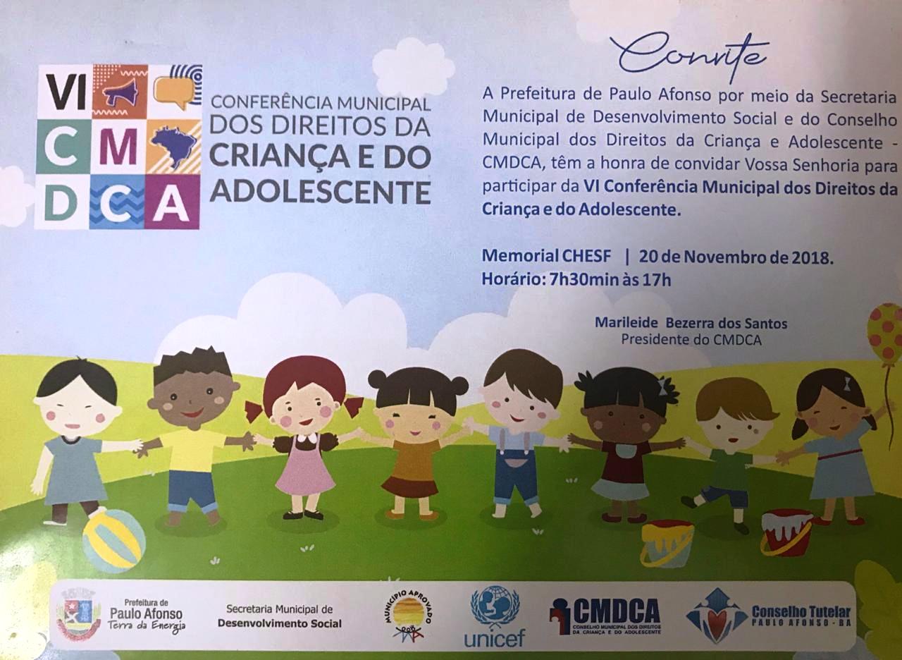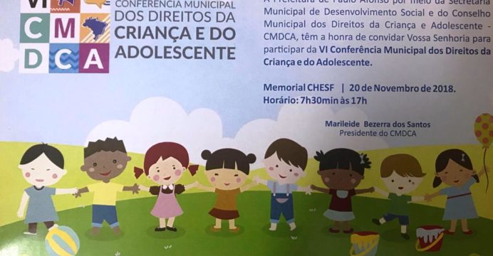No dia 20 de novembro a Secretaria de Desenvolvimento Social (Sedes) e o Conselho Municipal dos Direitos da Criança e do Adolescente realizam a VI Conferência Municipal dos Direitos da Criança e do Adolescente.