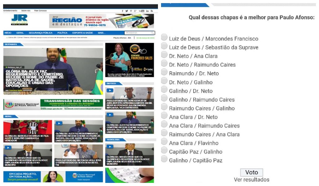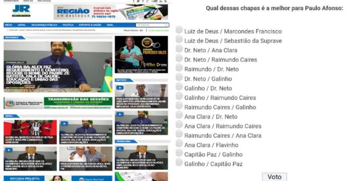 O JRemDestaque.Net postou uma enquete no site, onde faz a seguinte pergunta? Qual dessas chapas é a melhor para Paulo Afonso Bahia?. Essa enquete envolve vários pré candidatos a prefeito do município.
