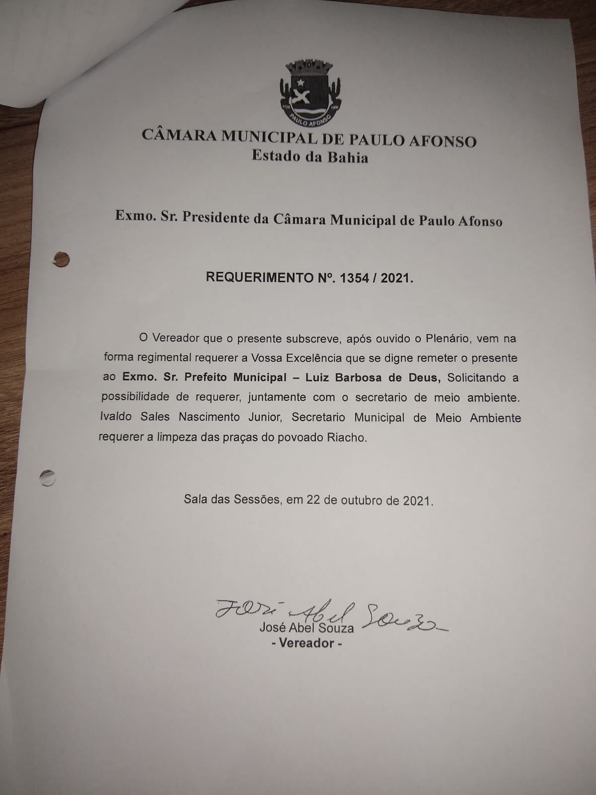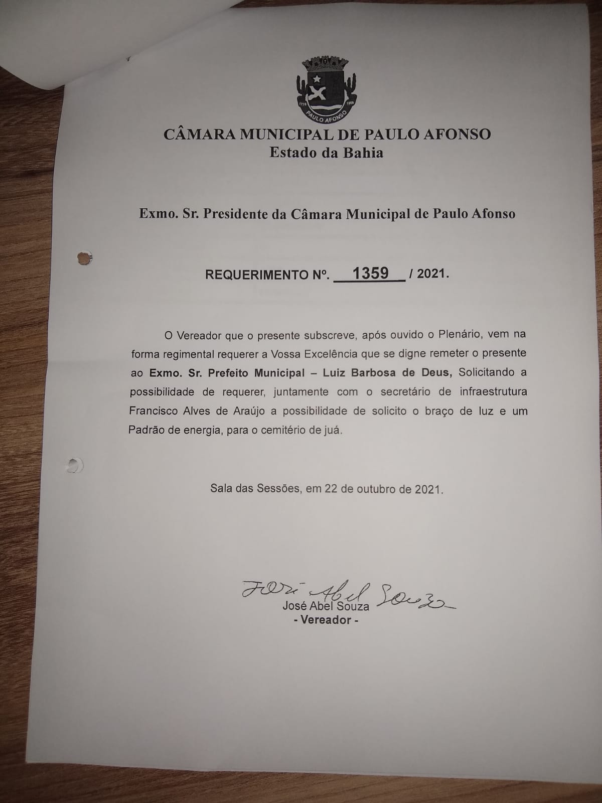 O Vereador José Abel Souza “Zé de Abel-PSC deu entrada hoje 25 de outubro de 2021 na Câmara Municipal de Vereadores da cidade de Paulo Afonso Bahia em dois Requerimentos de números 1359/2021 e 1354/2021. Esses requerimentos tem sempre como objetivo a melhoria das comunidades rurais.