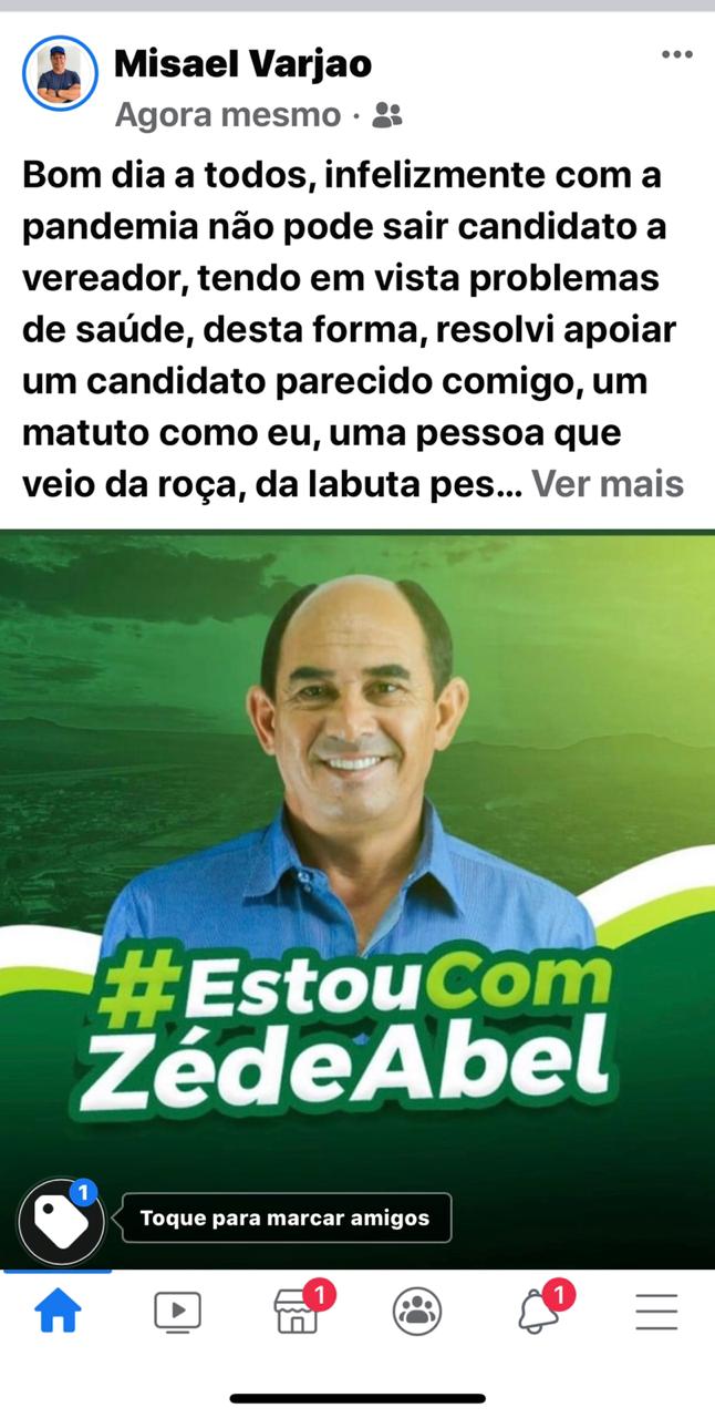 Zé vem fazendo várias visitas nas comunidades rurais, bairros periféricos e centro da cidade. Seu nome vem sendo fortalecido com vários apoios por onde anda. Depois de ter passado por um período de quarentena devido o Covid-19, onde perdeu sua esposa para o vírus, Zé de Abel corre para recuperar esse período que ficou no isolamento.