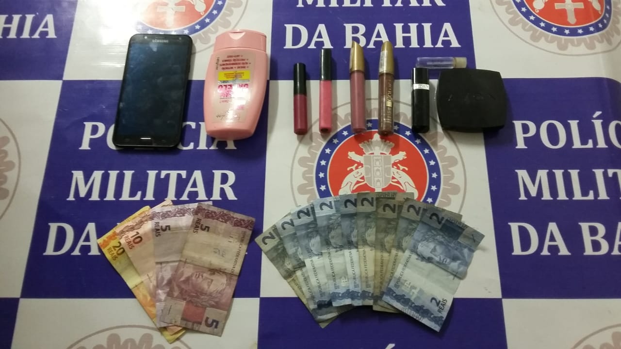 01 (um) aparelho celular de marca Samsung Galaxy J7; R$ 58,00 em espécie; 01 (uma) bolsa feminina.