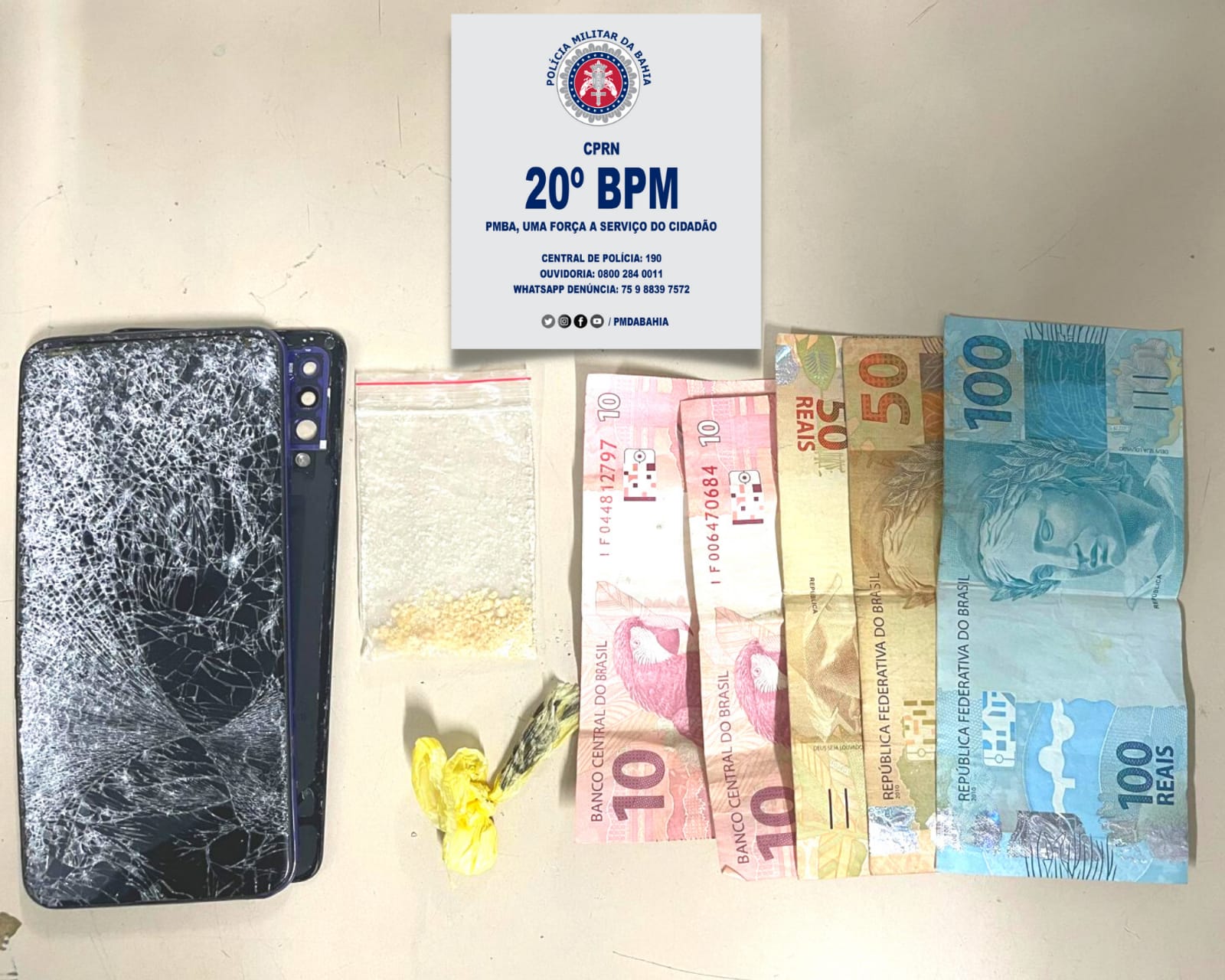 Na oportunidade, foi feita apresentação do seguinte material: . 01 trouxinhas de substância análoga à cocaína; . 01 saquinho com substância análoga à crack em pó; . 01 smartphone Samsung A30, de cor azul com a tela totalmente quebrada; . 01 cédula de 100 reais; 02 cédulas de 50 reais e 02 cédulas de 10 reais, contabilizando 220 reais em dinheiro.