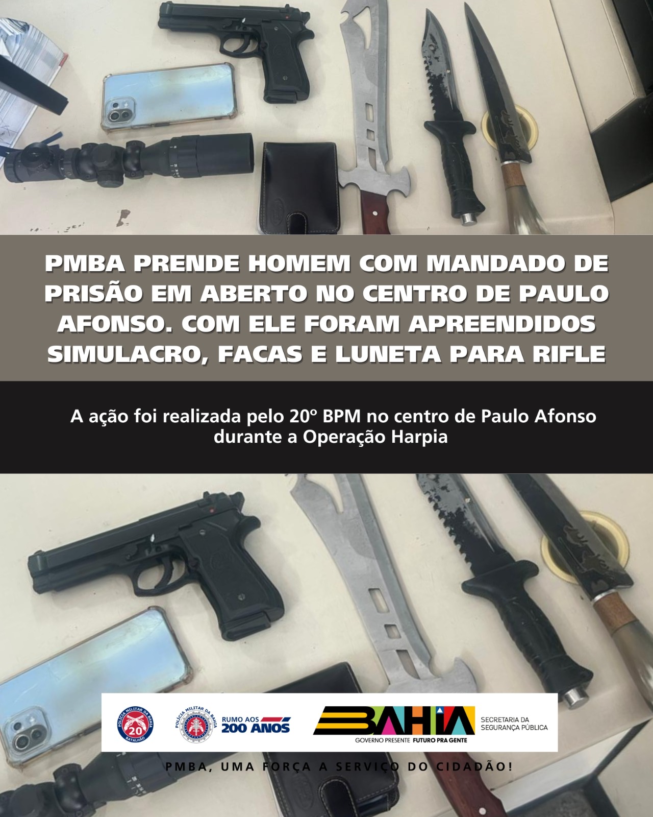 De forma imediata, a guarnição dirigiu-se ao local indicado, onde localizou o suspeito. Durante a abordagem, foram apreendidos em posse do homem um simulacro de pistola, três facas e uma luneta para rifle calibre 5.5mm. Após consulta ao sistema, confirmou-se a existência do mandado de prisão em desfavor do abordado.