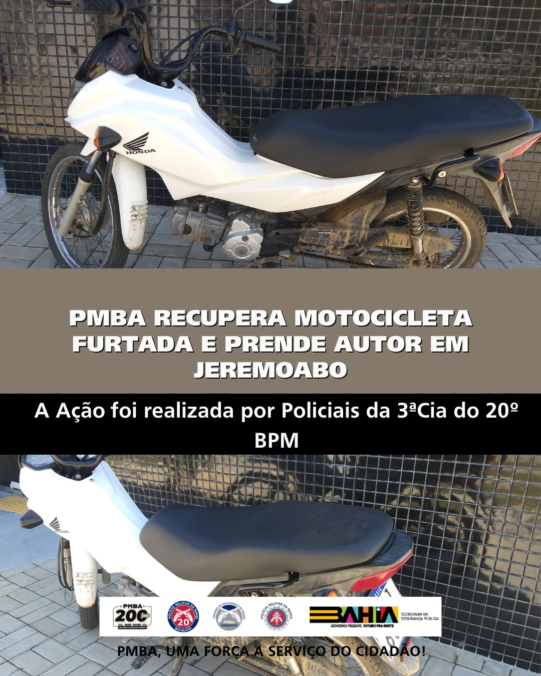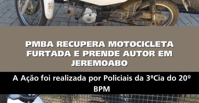 No dia de hoje (20), a guarnição da PMBA foi informada sobre o furto de uma motocicleta Honda Pop, de cor branca, fato ocorrido em frente a uma residência na Rua Nova, próximo à Avenida Contorno, em Jeremoabo. De posse das informações, foram iniciadas buscas nos bairros da cidade. Com o apoio de populares, foi recebida a informação de que o veículo estaria nas proximidades do Povoado Ramos. De imediato, a equipe de motopatrulhamento deslocou-se ao local, logrando êxito na prisão do autor e recuperação da motocicleta furtada nas proximidades do trevo que conecta a BR-235 com a BR-110. O autor foi devidamente identificado e conduzido à Delegacia Territorial de Jeremoabo, onde foi apresentado às autoridades competentes para as medidas cabíveis.