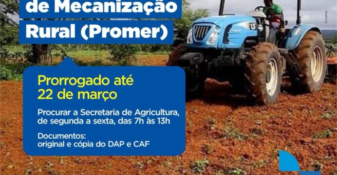 O prazo de inscrição para o Programa de Mecanização Rural (Promer) de 2024 foi estendido. Agora, os agricultores têm até o dia 22 de março para se inscreverem. Atualmente, a equipe está responsável pelos registros de atividades como aração e preparo do solo, bem como pela construção e manutenção de barreiros, pontos de água e barragens. A Secretaria de Agricultura e Aquicultura enfatiza que os agricultores que já completaram o processo de inscrição não necessitam fazê-lo novamente.