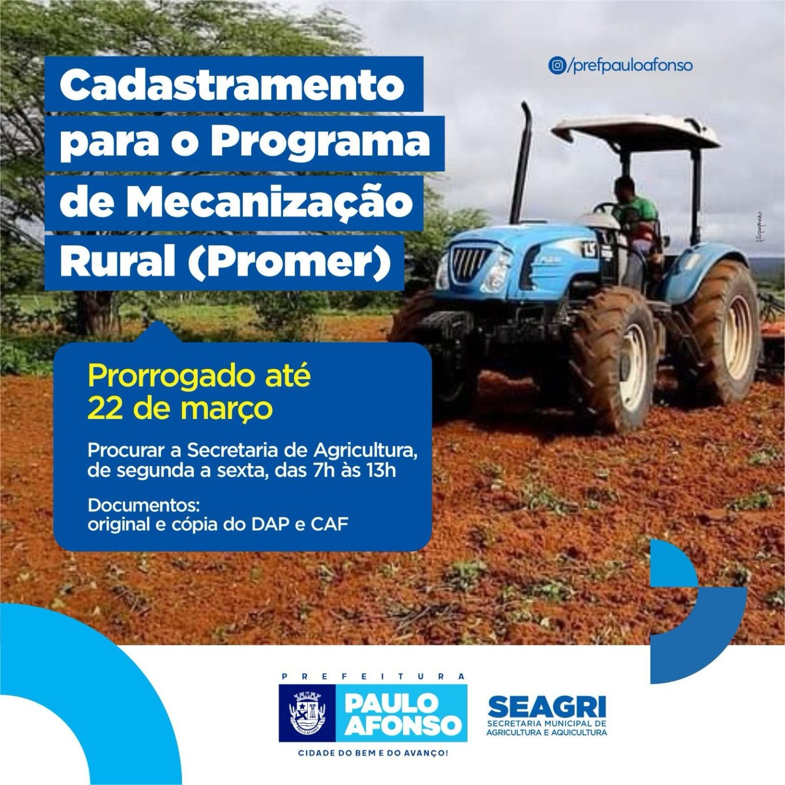 Para participar do programa, os interessados devem se dirigir à Secretaria de Agricultura de Paulo Afonso, de segunda a sexta-feira, das 7h às 13h. É necessário apresentar o original e uma cópia da Declaração de Aptidão ao Pronaf (DAP) e do Cadastro Nacional de Agricultura Familiar (CAF), ambos ativos, além de fornecer um número de telefone para contato.