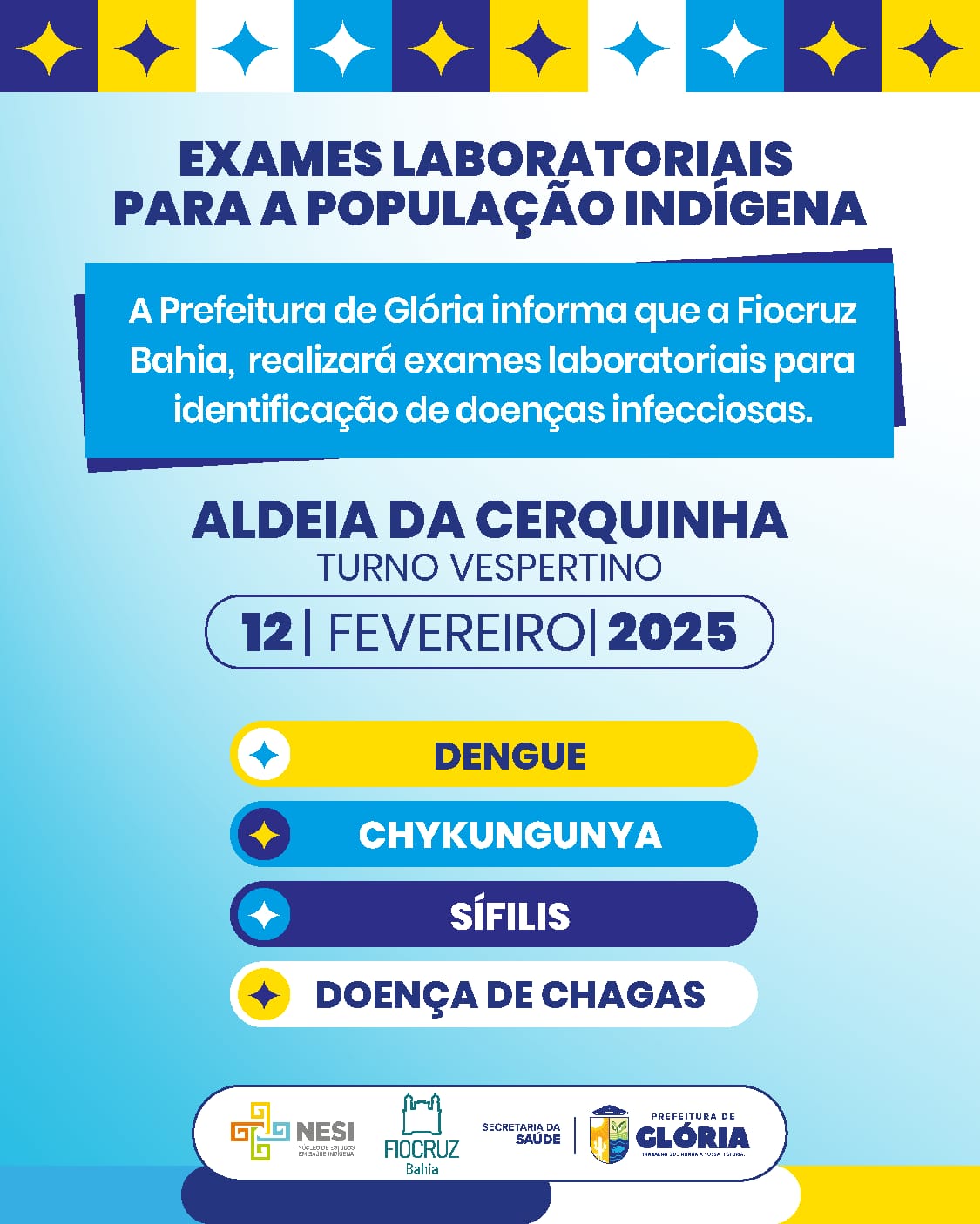 A Prefeitura de Glória, por meio da Secretaria Municipal de Saúde, está apoiando a realização do Estudo Multicêntrico de Doenças Infecciosas na População Indígena, uma importante iniciativa da Fiocruz Bahia, em parceria com o Distrito Sanitário Especial Indígena da Bahia (DSEI-BA), os Conselhos Locais e Distritais de Saúde Indígena e renomadas universidades, como a Universidade Federal da Bahia (UFBA), Universidade de Brasília (UnB), Universidade Estadual de Santa Cruz (UESC) e Universidade Federal da Grande Dourados (UFGD).