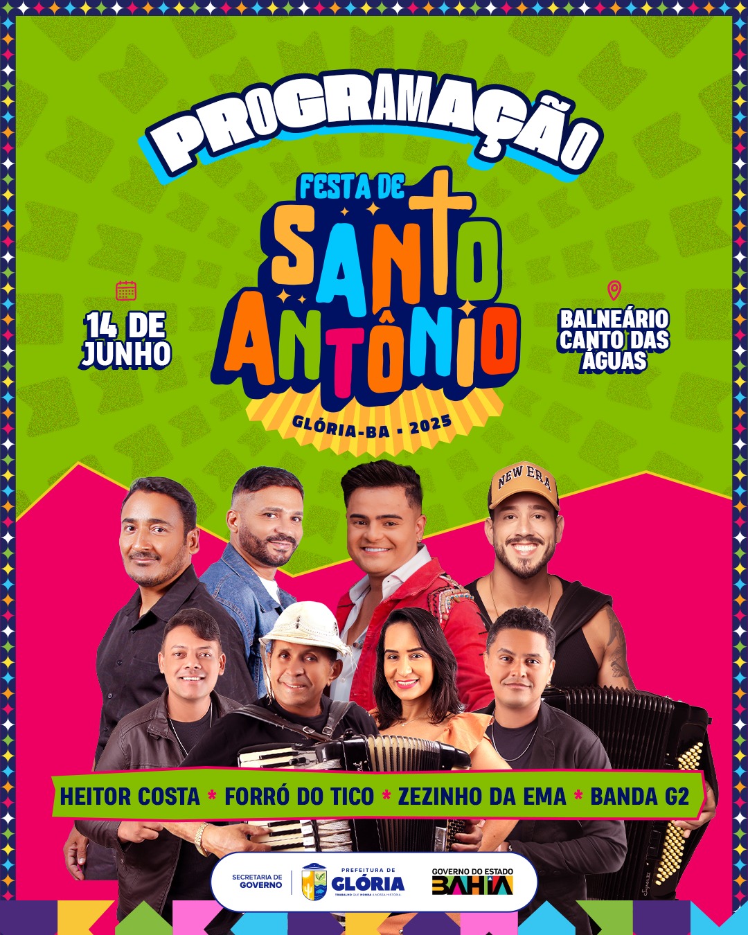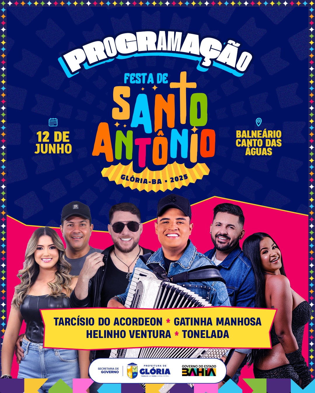 A Prefeitura Municipal de Glória anunciou a programação oficial da tradicional Festa de Santo Antônio, que promete movimentar o Balneário Canto das Águas entre os dias 12 e 15 de junho. Reconhecida como o melhor festejo junino da região, a festa deste ano chega ainda mais especial, reunindo grandes atrações, muita cultura, tradição e animação no nosso Litoral do Sertão.
