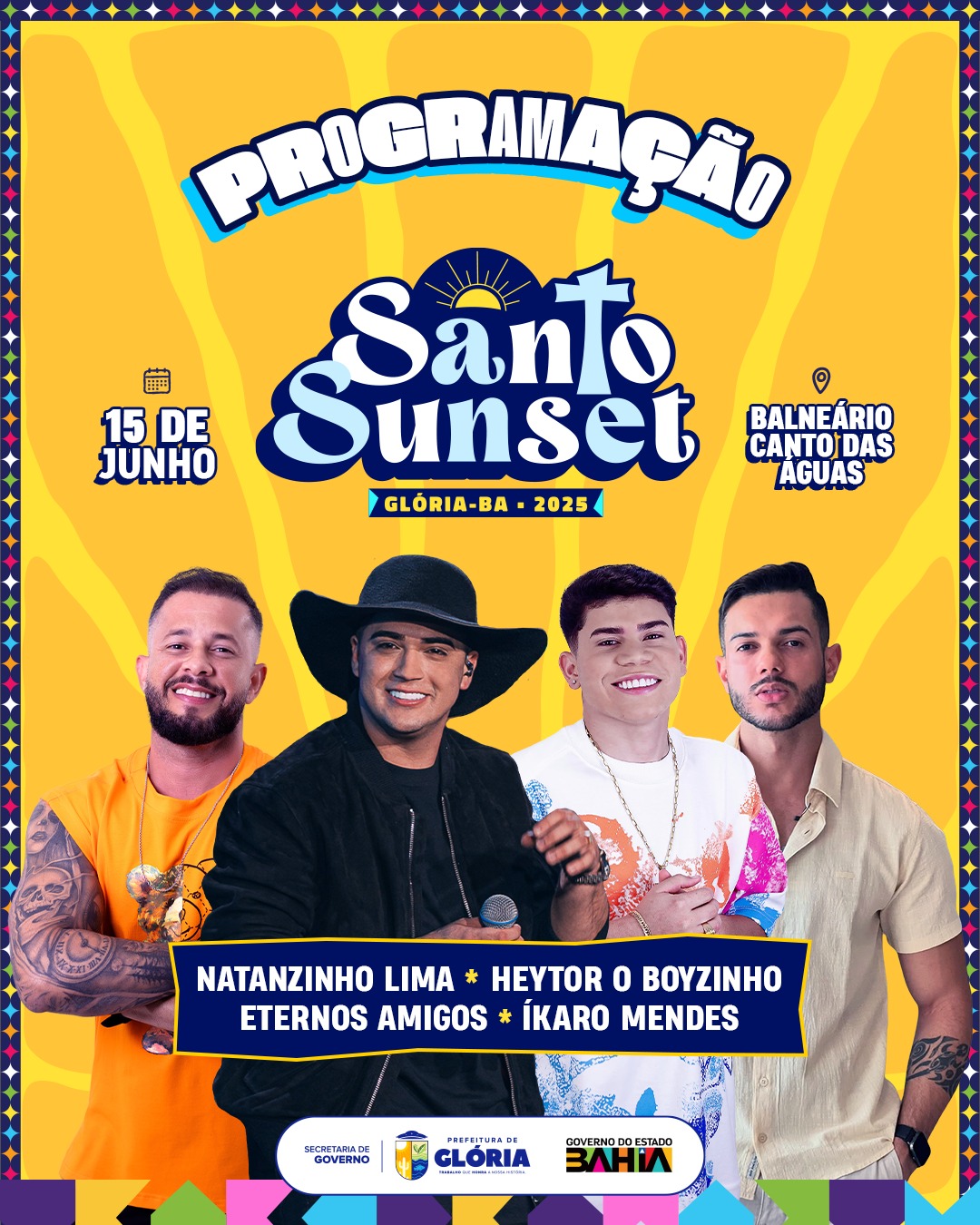 O grande encerramento acontece no dia 15 de junho, com o aguardado Santo Sunset. Em um fim de tarde mágico à beira do Balneário, o público vai curtir o pôr do sol ao som do tão aguardado Natanzinho Lima, Íkaro Mendes, trazendo o arrocha apaixonado, Eternos Amigos, com muito pagode envolvente, e Heitor, o Boyzinho, completando a noite com hits que vão fazer geral dançar até o último minuto!