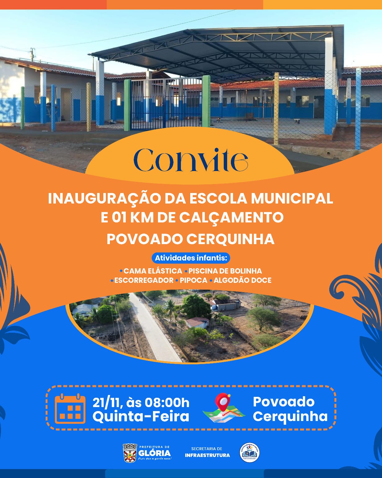A Prefeitura Municipal de Glória convida toda a comunidade para um dia especial no povoado Cerquinha, nesta quinta-feira, 21 de novembro de 2024. A programação terá início às 8h, com a tão aguardada inauguração da Escola Municipal e da pavimentação de 1 km de calçamento, obras realizadas com recursos próprios, que representam um grande marco para o desenvolvimento da região.