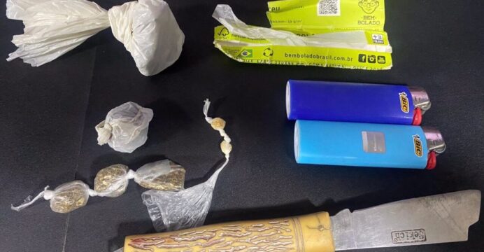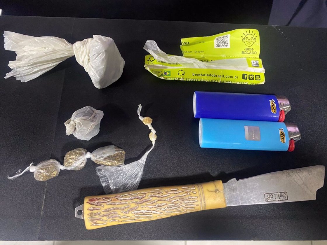 A equipe da Rádio Patrulha estava realizando rondas na área quando notou um indivíduo em atitude suspeita. Após a abordagem e a busca pessoal, os policiais encontraram com o suspeito duas pedras de crack, um papelote de maconha, quatro porções de maconha e um canivete.