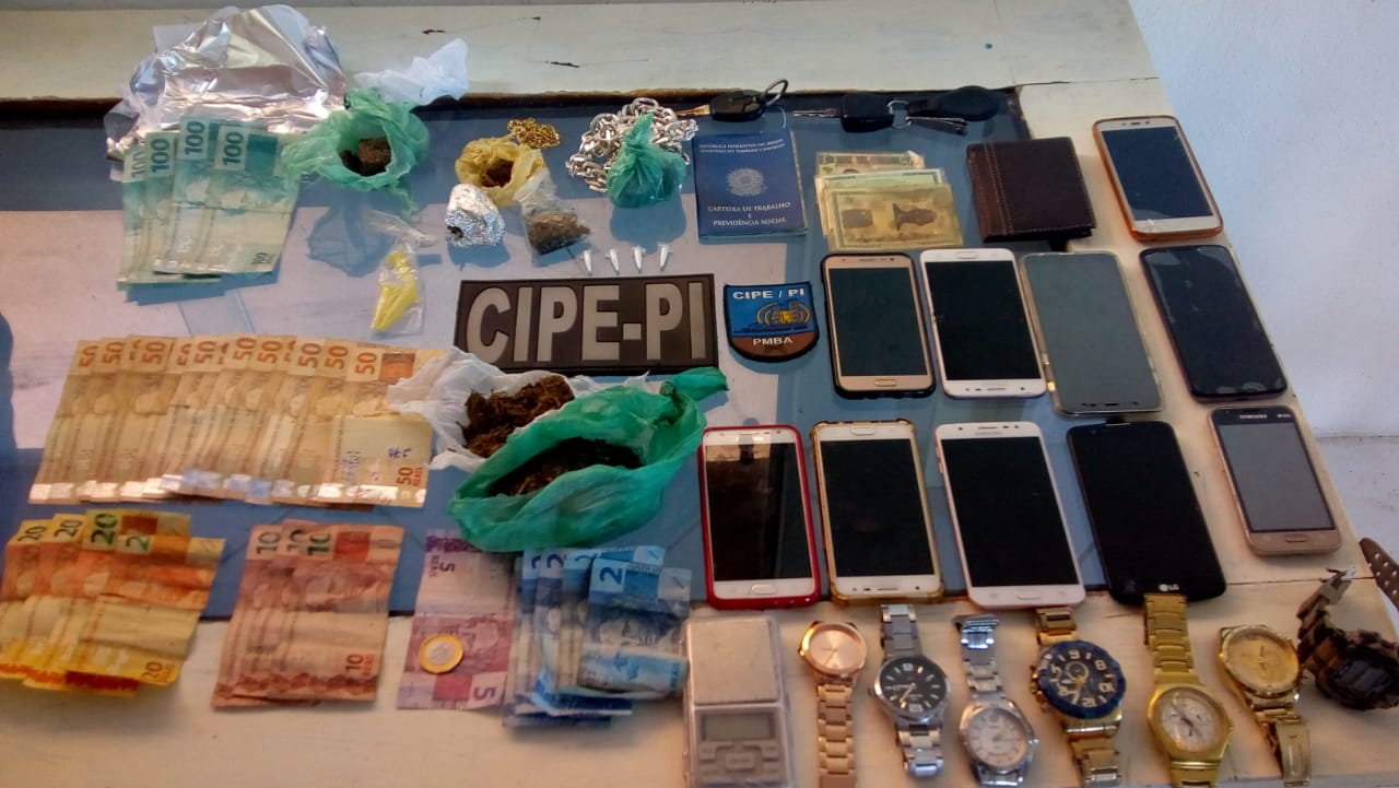 MATERIAL APREENDIDO: 07 Trouxas de maconha; 121 pedras de crack; 05 pinos de cocaína; 02 balanças de precisão; Papel alumínio; 08 relógios de pulso; 10 celulares de diversas marcas; 01 batidão de prata; R$ 1079,65 em espécie.