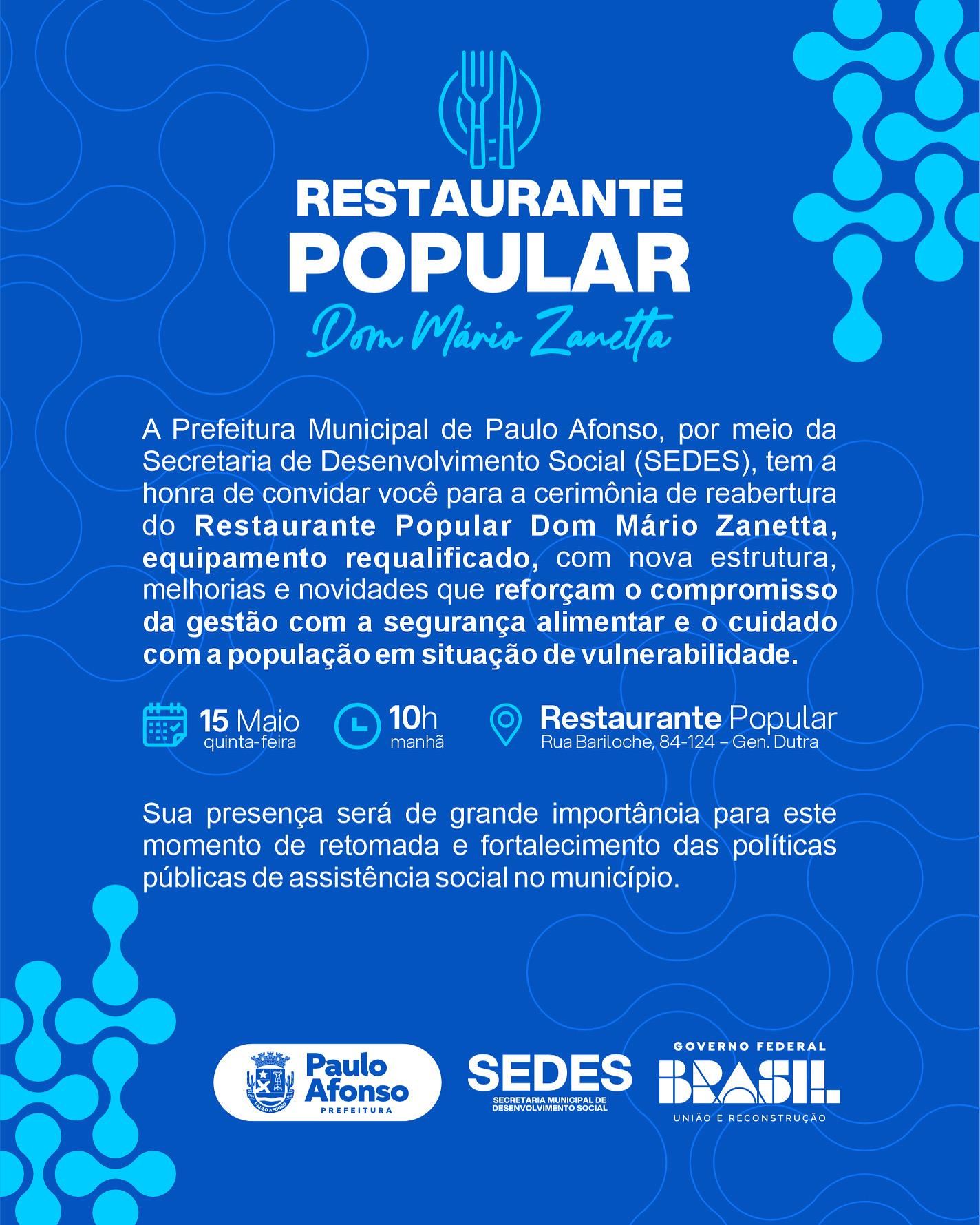 De segunda a sexta-feira, no Restaurante Popular Dom Mário Zanetta, a partir das 10h30, vai servir almoços e, a partir das 17h, sopas. O restaurante popular, que atende trabalhadores, idosos e pessoas em situação de vulnerabilidade, é um instrumento previsto na política nacional de segurança alimentar e nutricional para municípios de maior porte, que inclui a cidade de Paulo Afonso.