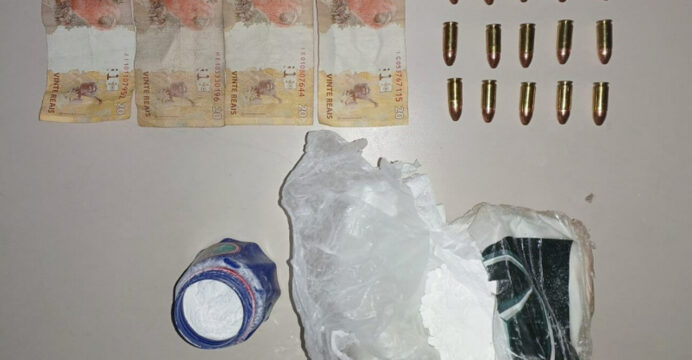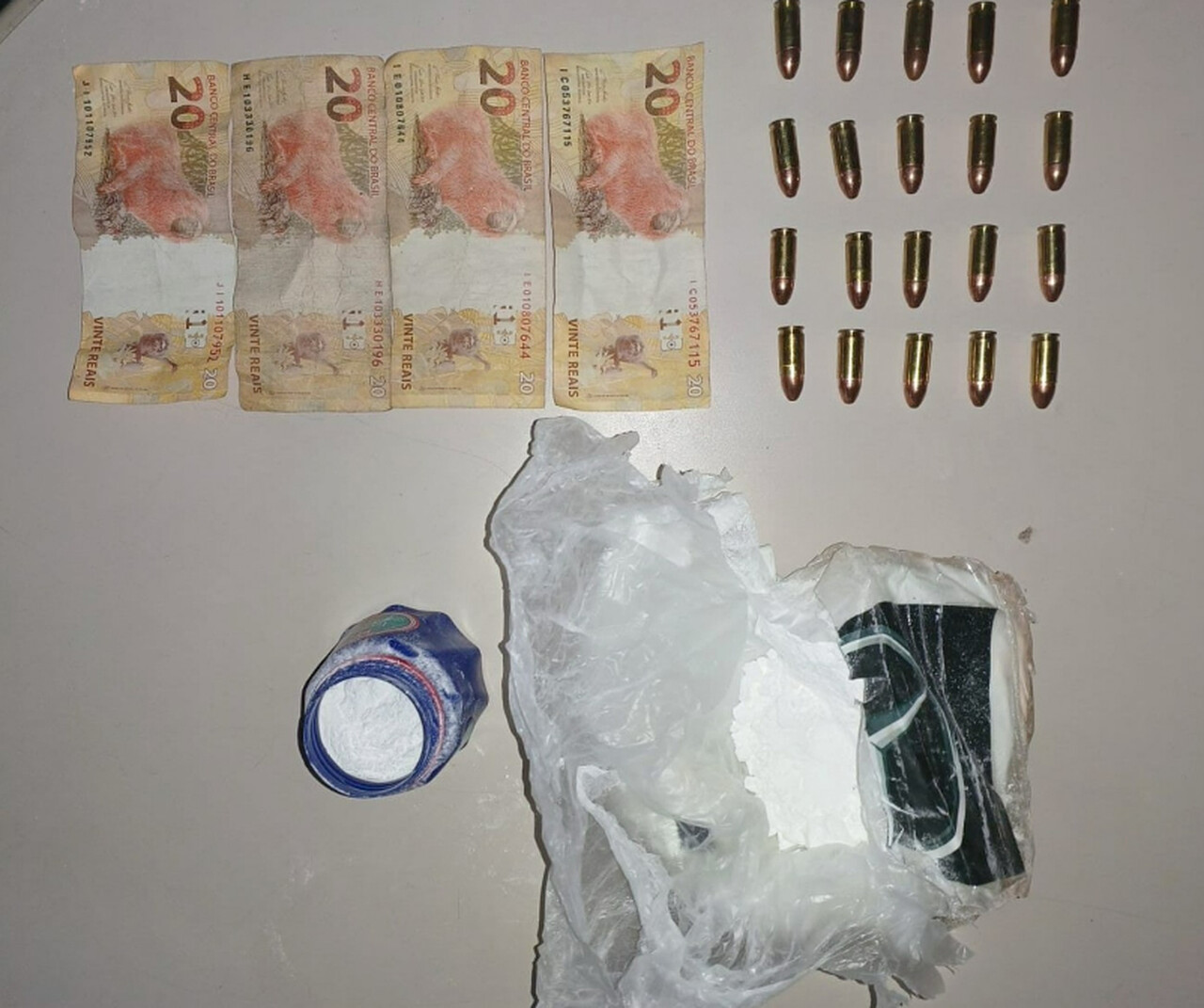 Dentro da bolsa, os policiais encontraram substâncias que aparentavam ser cocaína. Durante a abordagem, o suspeito quebrou seu celular ao jogá-lo no chão. Questionado sobre a presença de armas, ele informou que possuía apenas munições em sua residência. Os policiais se dirigiram ao local e encontraram 20 cartuchos de pistola calibre 9mm, de uso restrito.