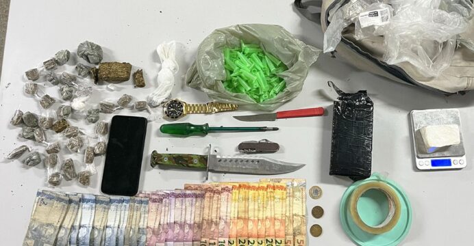 * 01 celular marca Samsung; * R$ 335,50 em espécie; * Uma pedra com 101g de substância análoga à cocaína; * Um tablete com 510g de substância análoga à maconha; * 32 trouxinhas de substância análoga à maconha pesando 200 gramas; * Uma balança de precisão; * Dezenas de sacos plásticos para armazenagem; * 100 pinos vazios para armazenagem de drogas; * Uma faca tática, um canivete, fita adesiva, uma mochila e um relógio de pulso na cor dourada.