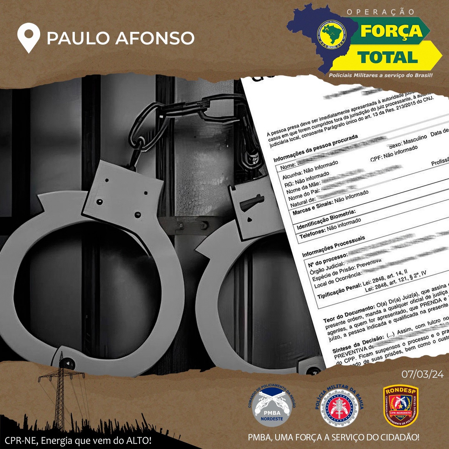 Por volta das 16h15, durante a operação “FORÇA TOTAL”, a equipe da RONDESP NORDESTE, dirigiu-se à Travessa do Ouvidor, no bairro Alves de Souza, em Paulo Afonso, onde as informações indicavam a presença de um indivíduo com um possível mandado de prisão em aberto. Com a diligência, os policiais realizaram a abordagem e, após consulta ao banco nacional de mandados, confirmaram a existência do mandado de prisão em aberto. O indivíduo foi conduzido à delegacia para as devidas providências legais.