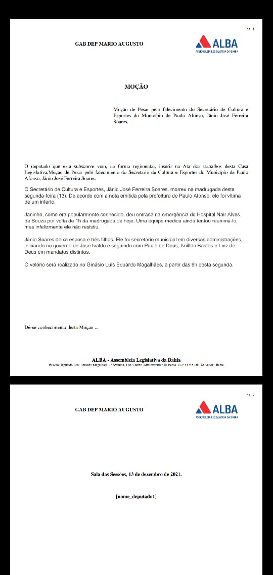 O deputado estadual Mário Augusto de Almeida Neto conhecido popularmente por Jacó Lula da Silva-PT, deu entrada ontem 13 de dezembro de 2021, na ALBA-Assembleia Legislativa da Bahia com uma Moção de Pesar pelo falecimento do Jânio José Ferreira Soares “Janinho”, Secretário de Cultura e Esporte da Prefeitura Municipal de Paulo Afonso Bahia.
