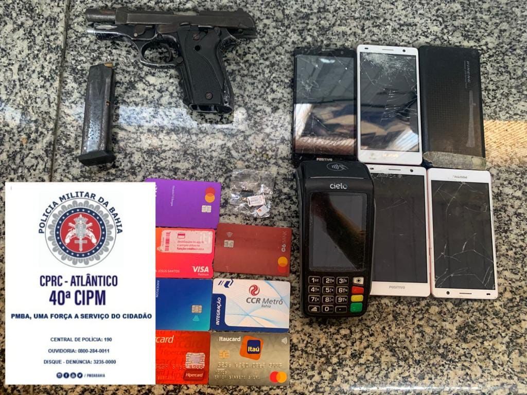Foi encontrado em poder do agressor uma pistola cal 380, (01) carregador com cinco munições intactas, (05) cinco aparelhos celulares, (06) seis cartões de creditos, (01) uma maquina de cartões, (01) um cartão de metrô, vários chips de celulares.