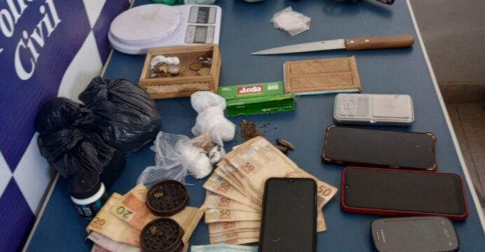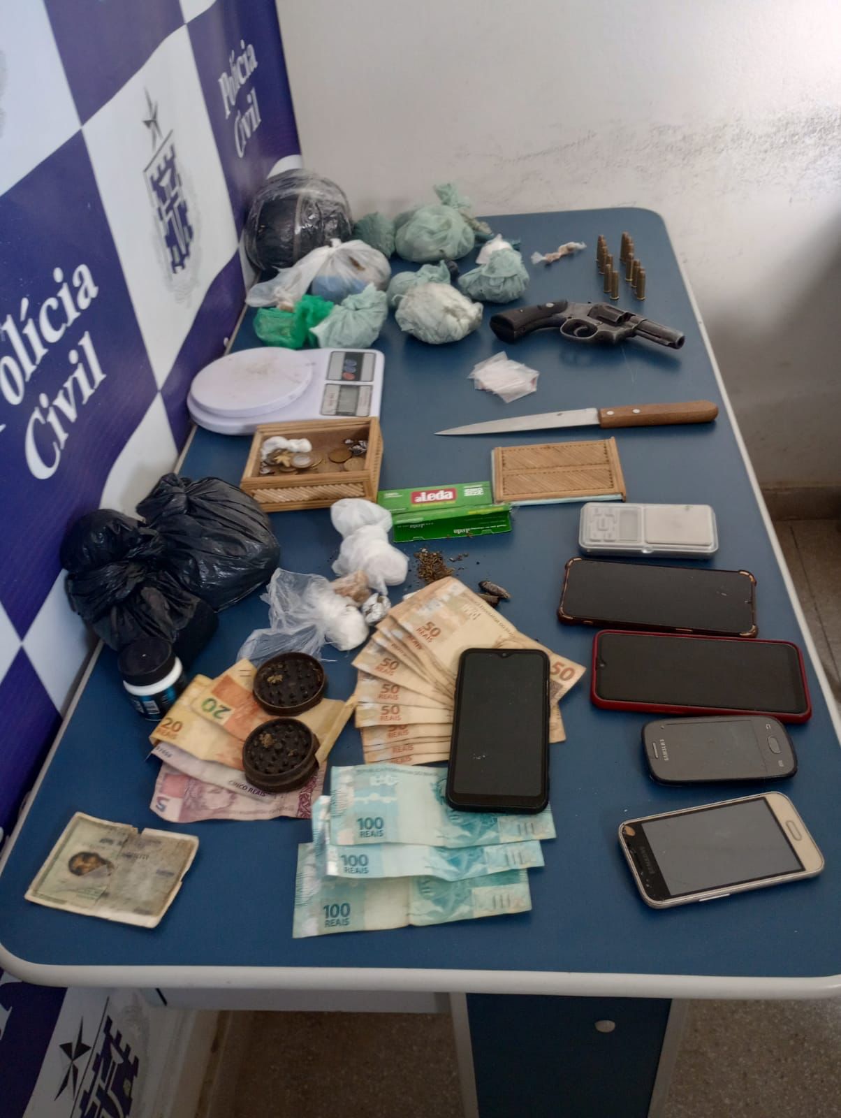 Que após uma busca foi encontrado e apreendido farta quantidade de drogas diversas, um revólver calibre 38, munições, balança de precisão, um brucutu.