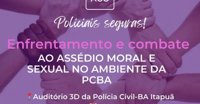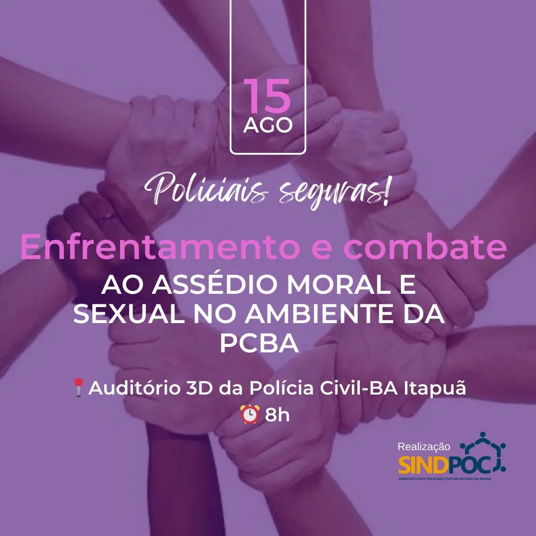 O Sindicato dos Policiais Civis do Estado da Bahia (Sindpoc) realizará um evento sobre o “Enfrentamento e combate ao assédio moral e sexual no ambiente da Polícia Civil da Bahia”, para conscientizar as servidoras sobre o tema e convida toda a categoria para participar. O Seminário acontecerá em 15 de agosto, no Auditório 3D da Polícia Civil (BA), em Itapuã.