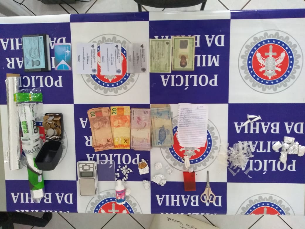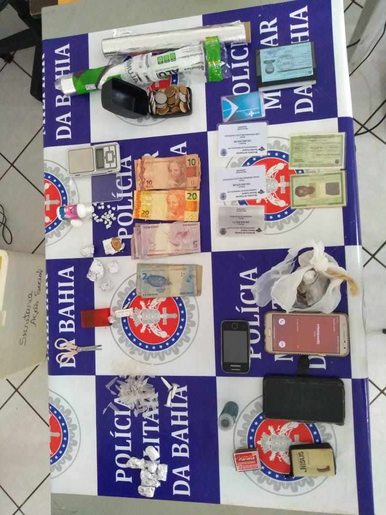 03 (três) pinos de cocaína cheios (Que estavam em seu bolso e ela fez a entrega); 41 (quarenta e um) pinos de cocaína vazios; 09 (nove) trouxas médias de maconha acondicionadas em papel alumínio; 01 (uma) certa quantidade de maconha; 04 (quatro) pedras de crack médias acondicionadas em papel alumínio; 22 (vinte e duas) pedras de crack pequenas acondicionadas em papel alumínio; 01 (uma) balança de precisão; 01 (uma) tesoura; 02 (dois) rolos de papel alumínio; 109,40 (cento e nove reais e quarenta centavos) sendo R$ 102,00 em cédulas de papel e R$ 7,40 em moedas, oriundos da venda da drogas; 01 (um) celular Samsung branco; 01 (um) celular LG – L40; 01 (uma) lista contendo nomes de clientes e com suas respectivas dividas.