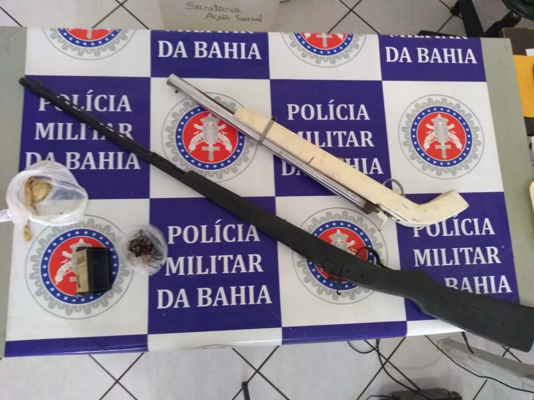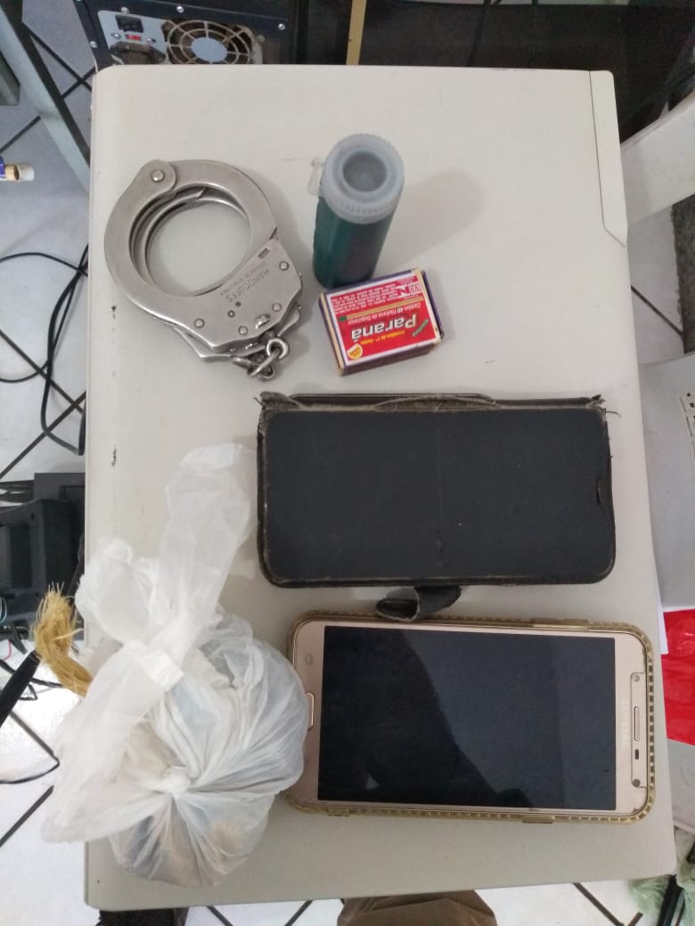 Chegando no mencionado local os policiais se depararam com o sogro do acusado CRISTIANO JOSÉ DOS SANTOS (Conhecido por Neguinho de Valdete) que autorizou a entrada em sua residência, quando adentraram o quarto onde estava Cristiano foi encontrado juntamente com ele duas espingardas de fabricação caseira, sendo uma delas feita de bengala de moto aparentando o mesmo calibre de uma espingarda Cal. 12, encontraram também um frasco plástico contendo pólvora, uma bolsa plástica contendo chumbo (parte de fábrica e outra quantidade de produção caseira contendo pedaços de chaparia e outros metais), uma bolsa tipo porta moedas contendo espoletas), uma (01) trouxa média de uma substância tipo maconha, um (01) celular LG e dois Samsung.