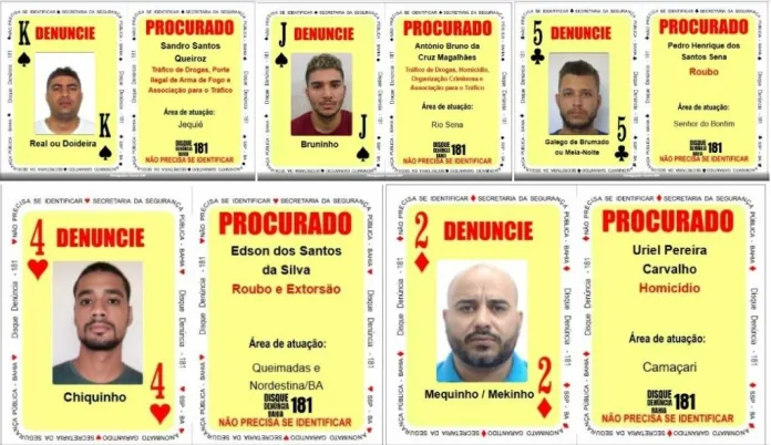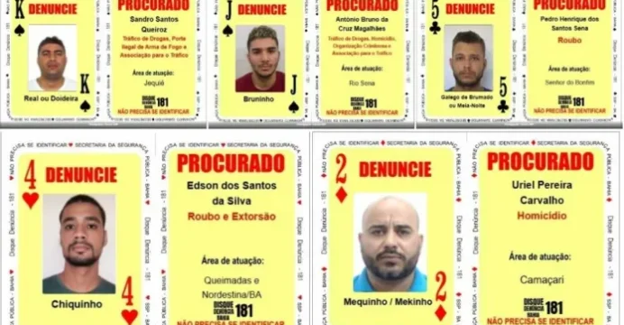 Informações que auxiliem na localização dos fugitivos podem ser enviadas pelo Disque Denúncia, pelo número 181, sob total sigiloA Secretaria da Segurança Pública da Bahia realizou a primeira atualização de 2025 do Baralho do Crime, ferramenta destinada a divulgar foragidos da Justiça envolvidos em crimes graves. Nesta edição, foram incluídas novas cartas nos naipes de Espadas, Paus, Copas e Ouros. A carta “Rei de Espadas” passa a ser ocupada por Sandro Santos Queiroz, conhecido como “Real” ou “Doideira”. Ele é líder de uma organização criminosa e é procurado por porte ilegal de arma de fogo, tráfico de drogas e associação para o tráfico em diversos bairros de Jequié. Em 2015, Sandro foi alvo da operação ‘Moeda Real’ e preso em Cuiabá. Antônio Bruno da Cruz Magalhães, conhecido como “Bruninho”, assume o posto de ‘Valete de Espadas’. Com dois mandados de prisão por homicídio, organização criminosa, associação e tráfico de drogas, o fugitivo atua na região do bairro Rio Sena, em Salvador. O foragido ainda mantém ligação com Luiz Henrique Santos Souza, conhecido como “Demorô” ou “Rick”, atual ‘Quatro de Ouros’. “Bruninho” também coordena grupos armados para eliminar traficantes rivais e disputar o controle territorial. A carta ‘Cinco de Paus’ passa a exibir Pedro Henrique dos Santos Sena, conhecido como “Galego de Brumado” ou “Meia-Noite”. Ele atua na cidade de Senhor do Bonfim, no Norte do estado, e possui mandado de prisão por tráfico de drogas, além de ser apontado como responsável pela guarda e distribuição de drogas e fornecer armas utilizadas em execuções realizadas por um grupo criminoso. Procurado pelos crimes de roubo e extorsão, Edson dos Santos da Silva, conhecido como “Chiquinho”, foi incluído na carta ‘Quatro de Copas’. Ele atua nos municípios de Queimadas e Nordestina. Já Uriel Pereira Carvalho, conhecido como “Mequinho” ou “Mekinho”, ocupa a posição do ‘Dois de Ouros’. Procurado por homicídio, ele é apontado como o chefe do tráfico de drogas em Camaçari, na Região Metropolitana de Salvador. Em 2024, ele ordenou o espancamento até a morte de um homem, cuja vítima teve o corpo abandonado pelos agressores. O Baralho do Crime segue disponível para consulta pública. Informações que auxiliem na localização dos fugitivos podem ser enviadas pelo Disque Denúncia, pelo número 181, sob total sigilo.
