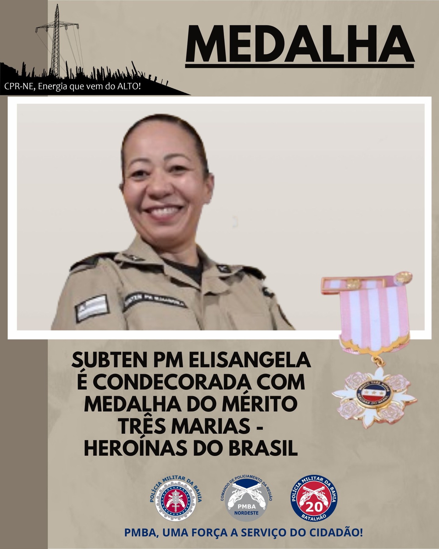 O COMANDANTE DO 20º BPM DESTACA E ENFATIZA A HONRARIA RECEBIDA PELA SUBTEN PM ELISÂNGELA: MEDALHA DO MÉRITO TRÊS MARIAS – HEROÍNAS DO BRASIL.
