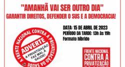 Data: 15 de abril de 2023 – Sábado Horário: Das 13h às 19h Formato: Híbrido (presencial e virtual simultaneamente) Link para o Formulário de Inscrição: https://forms.gle/z6xoqKi6BroSpvTT6 A Frente Nacional Contra a Privatização da Saúde (FNCPS) é...