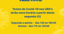 A partir desta segunda (5), os testes de Covid-19, que estão sendo realizados nas Unidades Básicas de Saúde (UBS’s) do Centro e do Bairro Tancredo Neves (BTN), ocorrerão em novo horário. Agora, a testagem será feita...