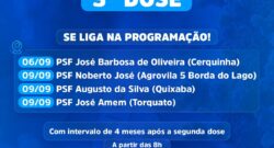 A Prefeitura Municipal através da Secretaria Municipal de Saúde informa que tem a vacinação da terceira dose para adultos +18 anos Contra a Covid19 nas Comunidades da Cerquinha, Agrovila 05 Borda do Lago, Distrito de Quixaba...