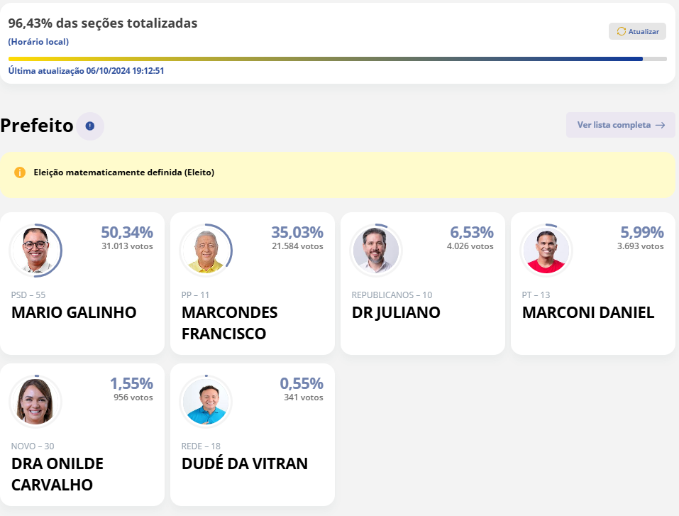Os outros candidatos terminaram a disputa com as seguintes colocações: Dr. Juliano ficou em terceiro, Marconi Daniel em quarto, Dr. Onildes Carvalho em quinto, e Dudé da VITRAN terminou em último lugar.